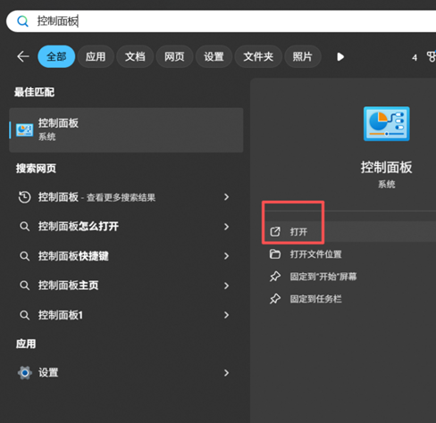 1.开始菜单搜索框搜索控制面板打开