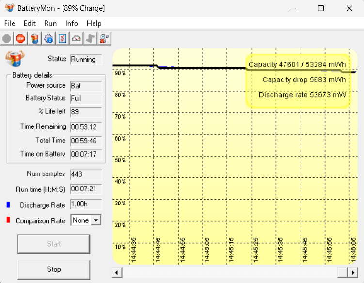 The battery report also logs a “Battery changed” event on 2025-10-13, although no physical replacement occurred. This was triggered by a driver reset, confirming EC-level misreporting. Additionally, battery life estimates and FCC readings are erratic, and the battery capacity history shows a steady decline from 55.1 mWh to 52.8 mWh within days of normal use.