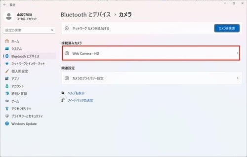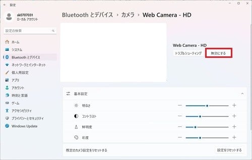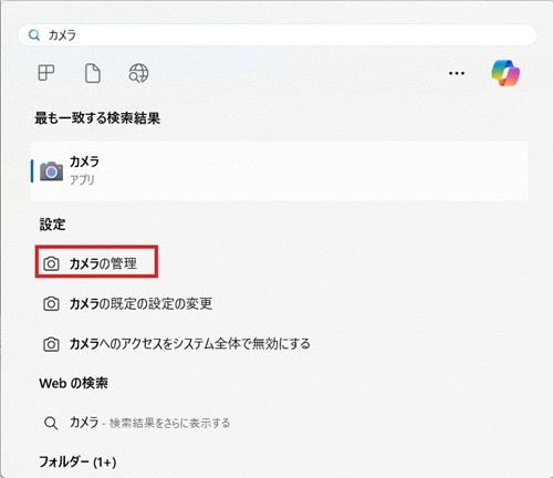 「Windows」マークをクリックします。 メニューが表示されますので、メニュー上部の検索バーに「カメラ」と入力し、「設定」の「カメラの管理」をクリックします。 「接続済みカメラ」から ON/OFF を切り替えたいカメラを探し、クリックします。 設定画面が表示されますので、「無効にする(もしくは「有効にする」)」をクリックします。