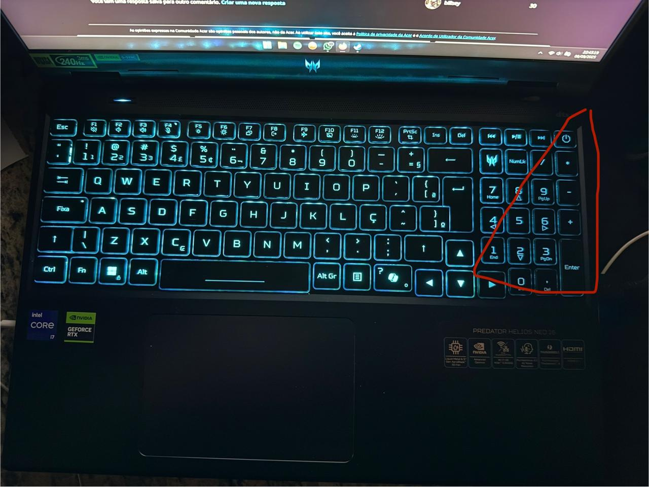 Acredito que esse problema já está acontecendo desde quando eu comprei, os leds da região do numpad ficam mais fracos que as do restante do teclado. Quando eu abro o Predator Sense para fazer alguma alteração nos leds e eu mudo qualquer coisa lá (exemplo, mudo de "iluminação global" para de "área") aí as luzes acendem novamente e fica normal. Tempo depois isso volta a acontecer, as luzes da região do numpad ficam fracas novamente até eu refazer esse processo de abrir o Predator Sense e fazer alguma alteração. Não importa em qual modo está, tanto o de área quanto o global apresentam o problema, e o que eu faço é simplesmente alternar de um para o outro, para que os leds voltem ao normal.
