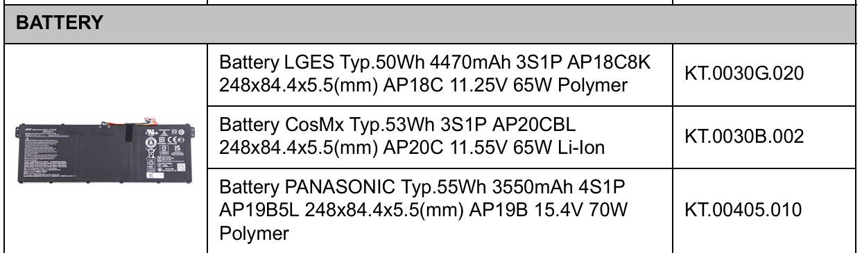 A bateria original é a AP18C8K, fabricante LGC, com voltagem de 11,83 V. O design da bateria é 48 Wh, mas após aproximadamente um ano e meio de uso a capacidade real caiu para 4,61 Wh, e atualmente ela descarrega a uma taxa de 11 W. O serial da bateria é 23698.