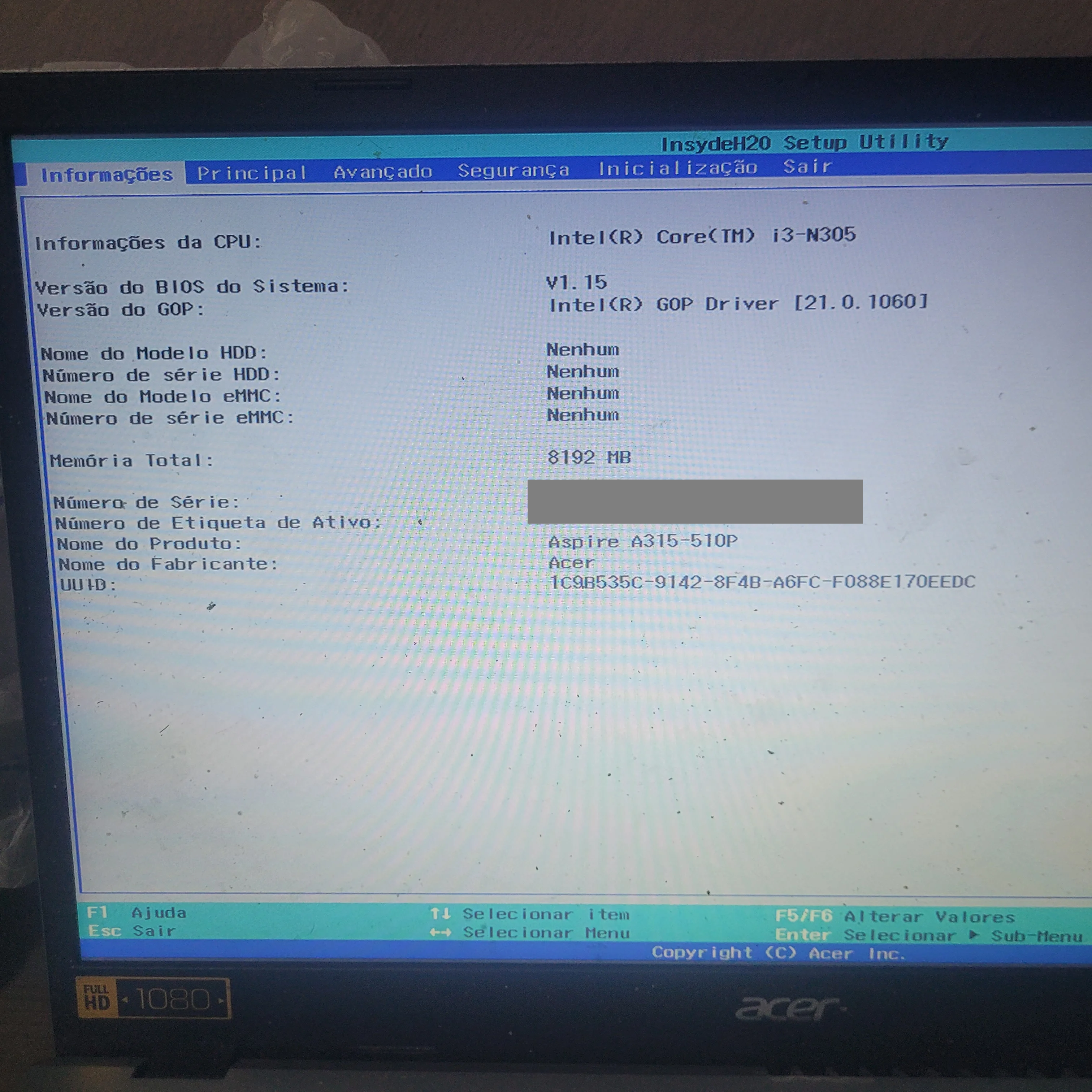 O notebook estava funcionando perfeitamente até ontem. Hoje, ao ligar, ele não consegue iniciar o Windows e exibe a mensagem de erro: 'No Bootable Device' Fui nna bios e vi que não tava reconhecendo o hd e emcc. Cheguei a conclusão que não pode ser resolvido com alguma configuração da bio, então queria saber se pode ser alguma peça mal encaixada ou vou precisar de uma outra placa mãe ou HD pra me preparar financeiramente. Me frustra pois ainda vai fazer 1 ano em dezembro, oque me faz não querer comprar mais nenhum produto da acer se for algo mais sério e caro.