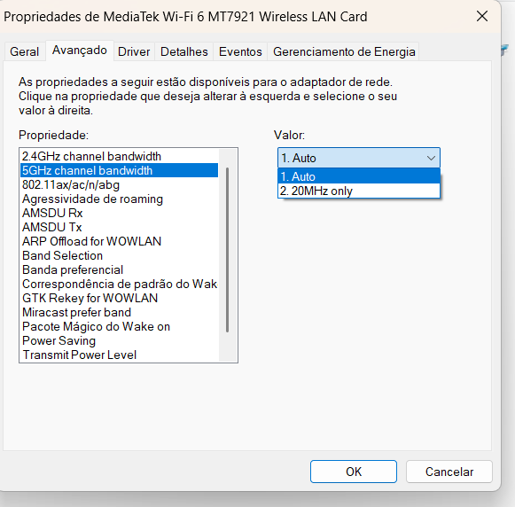 Parece ser um bug sério do driver MediaTek MT7921, que ativa alguma limitação de canal/banda e derruba a velocidade para ~20 Mbps, mesmo em redes de alta velocidade.