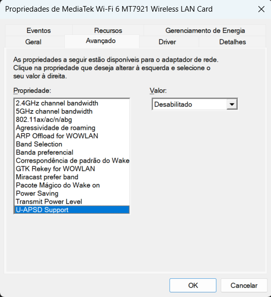 Quando o problema acontece, nas propriedades avançadas do adaptador aparecem opções extremamente limitadas: