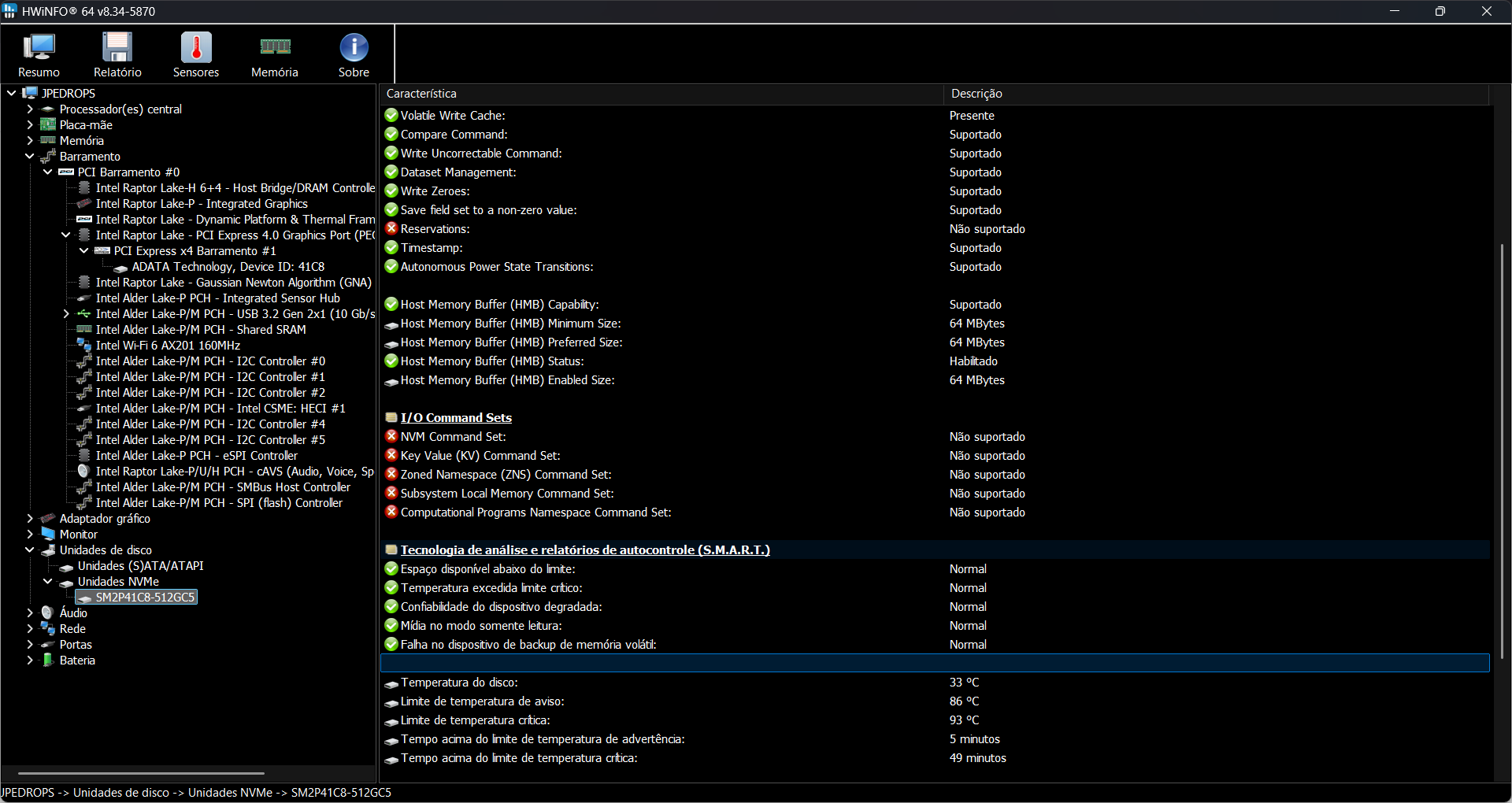 Comprei recentemente um Acer Aspire Go 15 AG15-71P76Z8, e recebi uma notificação de temperatura crítica detectada no disco NVMe, e ao verificar notei que ele sobe rapidamente para 96 °C diversas vezes durante o uso, e logo retorna a temperaturas entorno de 30 °C, tentei trocar distribuições Linux e até mesmo no Windows 11 o drive NVMe vem apresentando este comportamento, tentei verificar se há alguma atualização de firmware para o SSD, mas aparentemente ele já está na última atualização. Segue algumas informações e o arquivo csv gerado pelo HWiNFO com Windows 11. Modelo: SM2P41C8-512GC5 Firmware: X0124A0